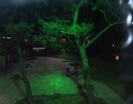 渡り廊下から見えるお庭のだだっ広いこと。緑のライトに松が幻想的に浮かび上がる。