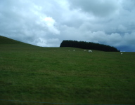 点在する羊たちの頭と足は黒い。 時たま、牛や馬。みんな下を向いて草を食む。