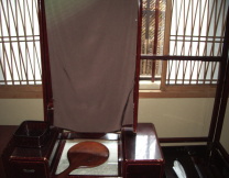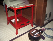 リモコンの横には 柊模様のついた 朱塗りの電話台 |