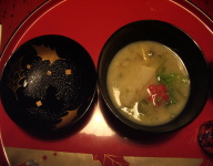 煮物椀 蕗味噌仕立 下仁田葱、蕗の薹 菜の花、人参 蓋にも柊の金彩 |