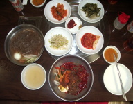 | この旅行で初めて おいしい韓国冷麺(混ぜ冷麺) に出会った 見た目は細い糸こんにゃく みたいだけれど味は絶品 |