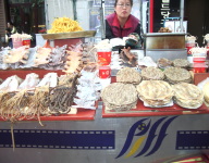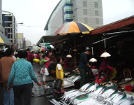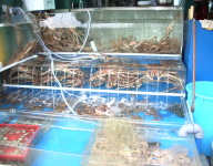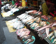 ここではいろんな活魚が山積みされ、又、水槽で、生きたまま、カニ・えび・貝類が売られていた。
