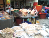 よく見ると、おじさんの左に 豚の頭部が売られていた 上を向いて、笑っているよう |