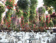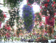 広いロビーの天井から、無数にぶら下がる色とりどりのハンギングフラワー