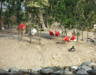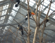 大きなネットの中で一部つながれていたり、全く、自由に飛び交っているのもいる。
