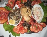 アサリ・かにの身を 取り囲むえび・えび えびの間に見える黒いものは プレッシバシュという岩に つく小さな貝 |