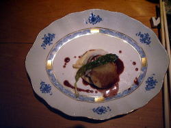 赤座えびとホタテ貝のソティ (ホワイトアスパラのピューレと 赤ワインソース) |